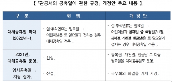 또한 2021년 6월 23일 대체공휴일 확대에 관한 법률안이 국회 행안위(행정안전위원회)를 통과하면서 기존 현행 안에서 3.1절, 광복절, 개천절, 한글날이 추가되어 대체공휴일 적용을 받게 되었습니다.