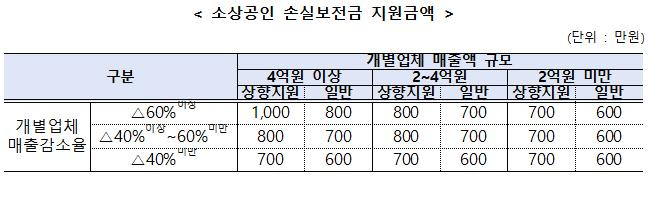 지원금액은 최소 600만원에서 최대 1,000만원입니다. 매출 규모 및 감소 규모에 따라 지원금액에 차등을 두었습니다.