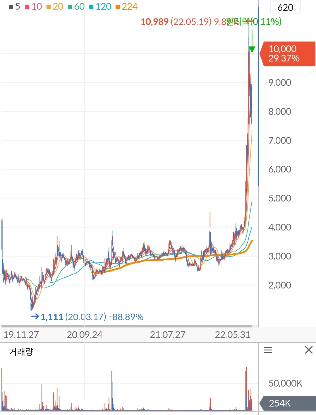 - 급등의 폭이 너무 커서 장기 이평선들과의 이격이 많이 벌어진 상태