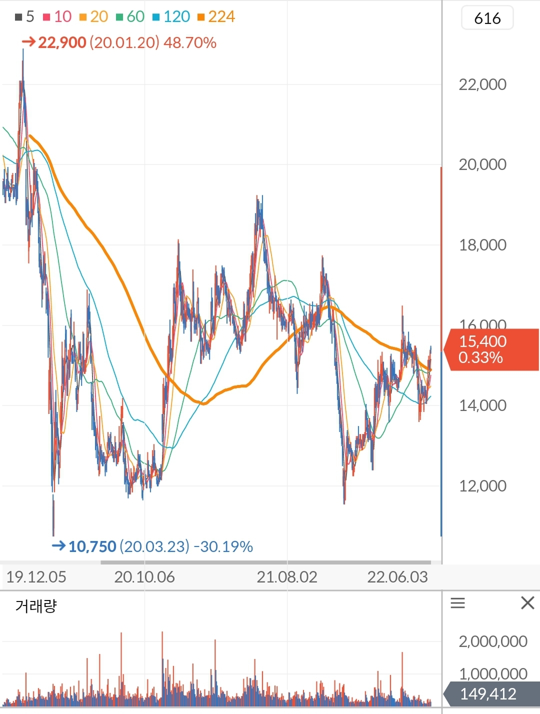 - 코로나 엔데믹 선언에 따른 정상화 기대감 ▲ 주가 15,000원대 상승