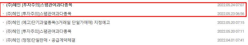- 스팸 관여 과다 종목은 문자를 통해 혜인이라는 종목을 무작위로 추천했다는 것을 의미합니다. 이것은 혜인 세력이 거래량을 늘리기 위해 시도한 것이 아닌 단톡방, 리딩 방들이 시간 외 상승률을 확인하고 주식 초보들을 상대로 문자를 보내 유혹하기 위한 수단으로 활용한 것으로 보입니다.
