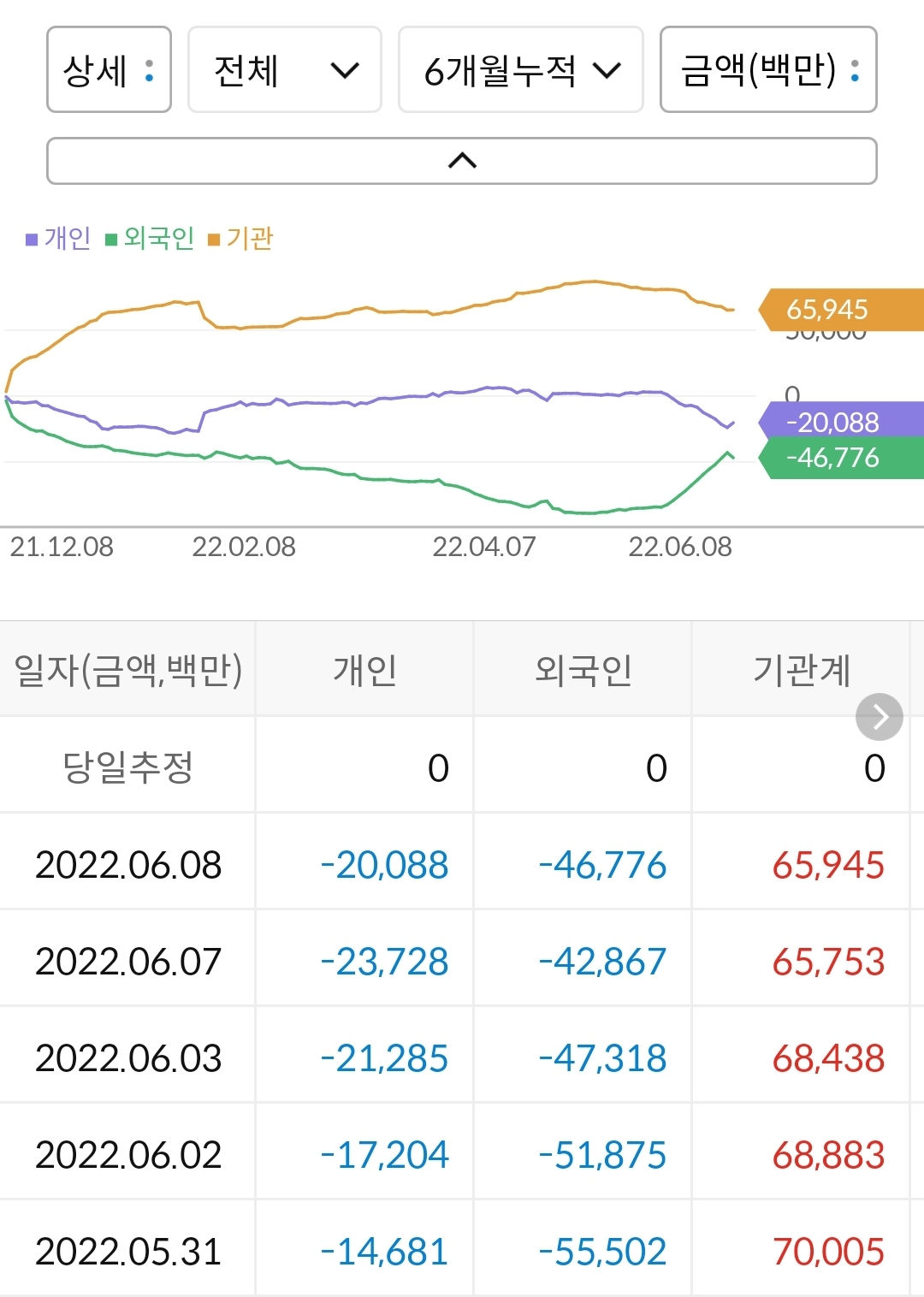 - 개인이 -200억 매도, 외국인이 -467억 매도, 기관이 659억 매수