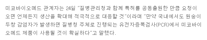 관련 기사 및 원숭이두창 자료를 보면 미코바이오메드는 질병관리청과 공동 출원한 진단키트기술을 보유하고 있습니다. 향후 질병의 국내 확산 및 해외 상황을 고려하여 제품이 사용될 가능성은 높은 것으로 보입니다.