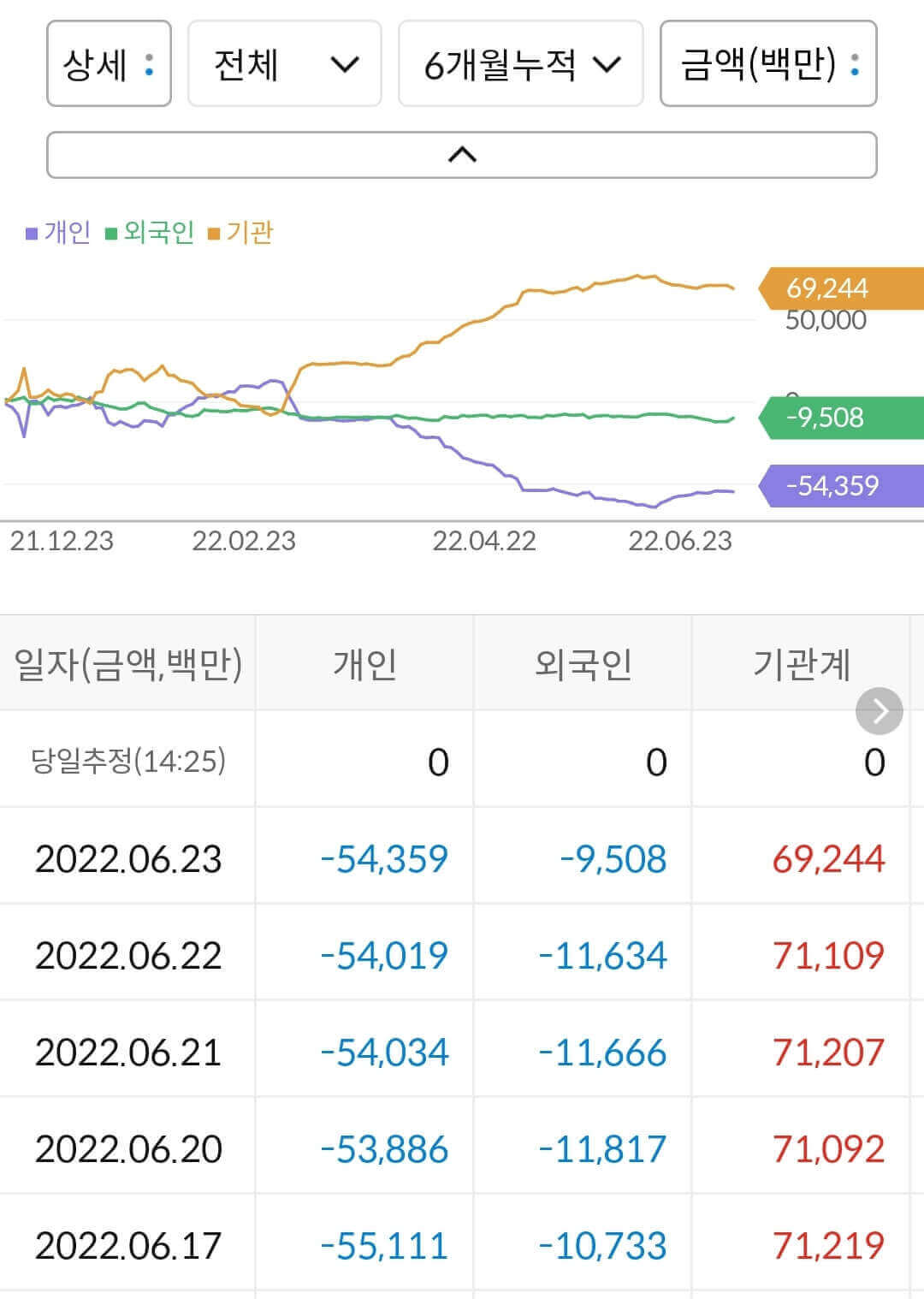 - 개인이 543억 매도, 외국인이 95억 매도, 기관이 692억 매수