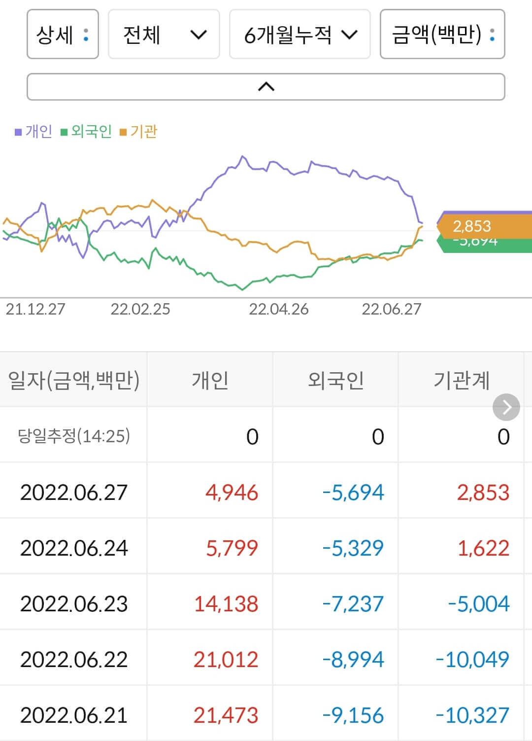 - 개인이 49억 매수, 외국인이 -56억 매도, 기관이 28억 매수