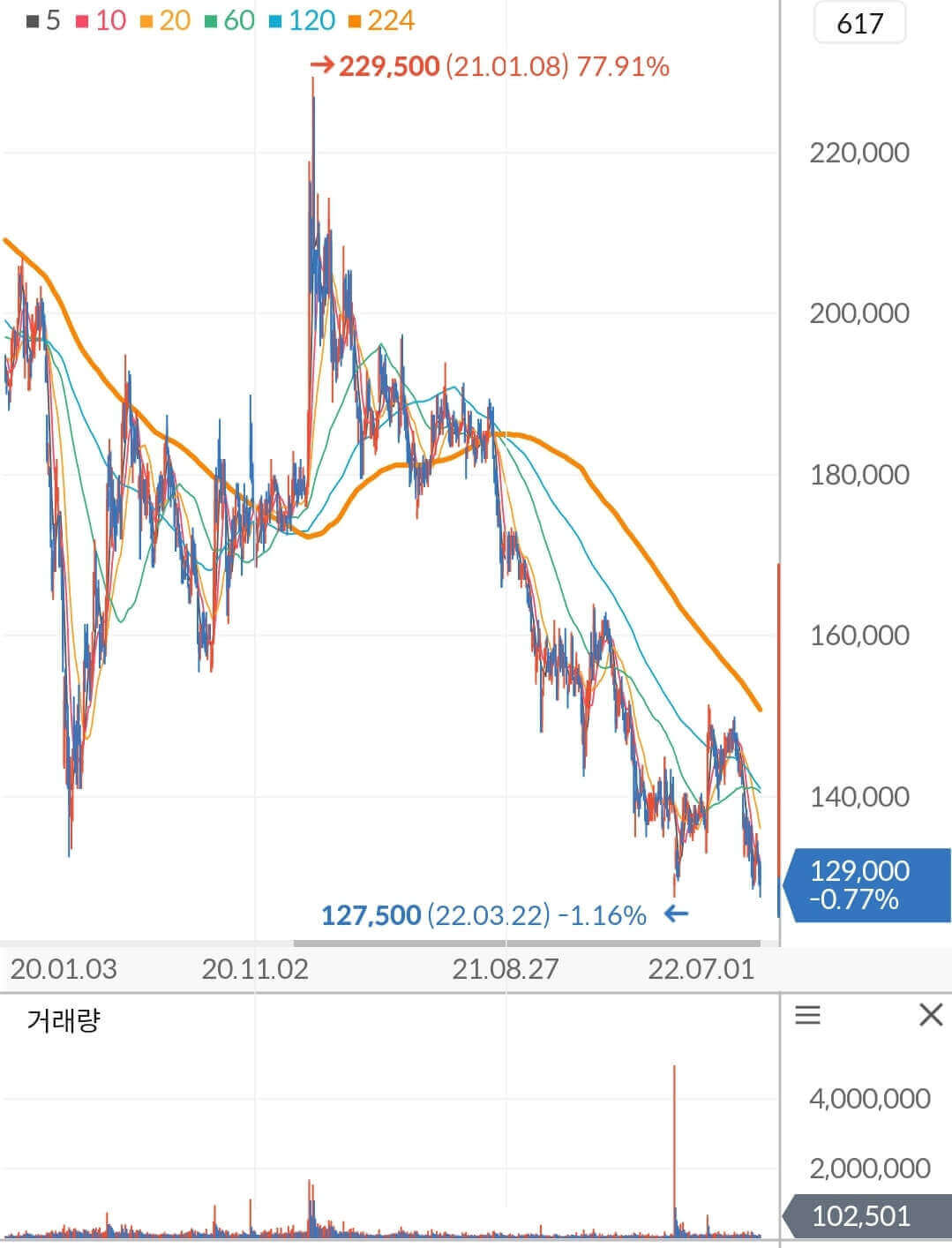 - 블록딜, 수익성 악화 및 재정 긴축으로 인한 지수 조정 ▼ 주가 120,000원대 하락