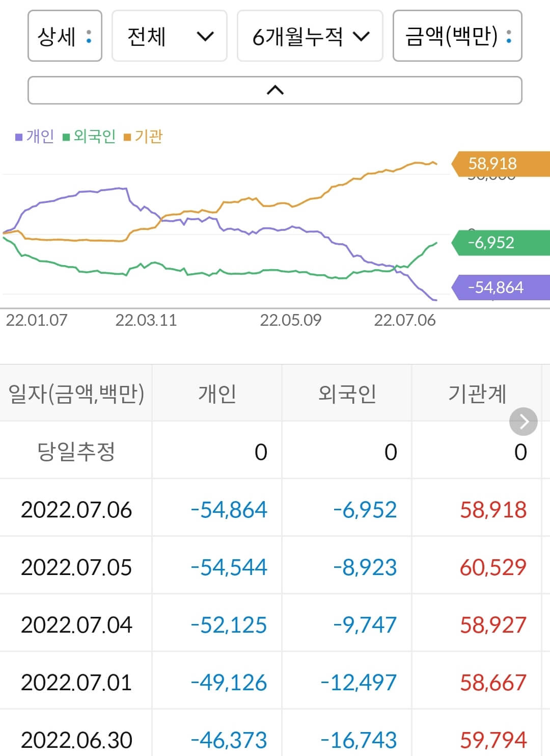 - 개인이 548억 매도, 외국인이 69억 매도, 기관이 589억 매수