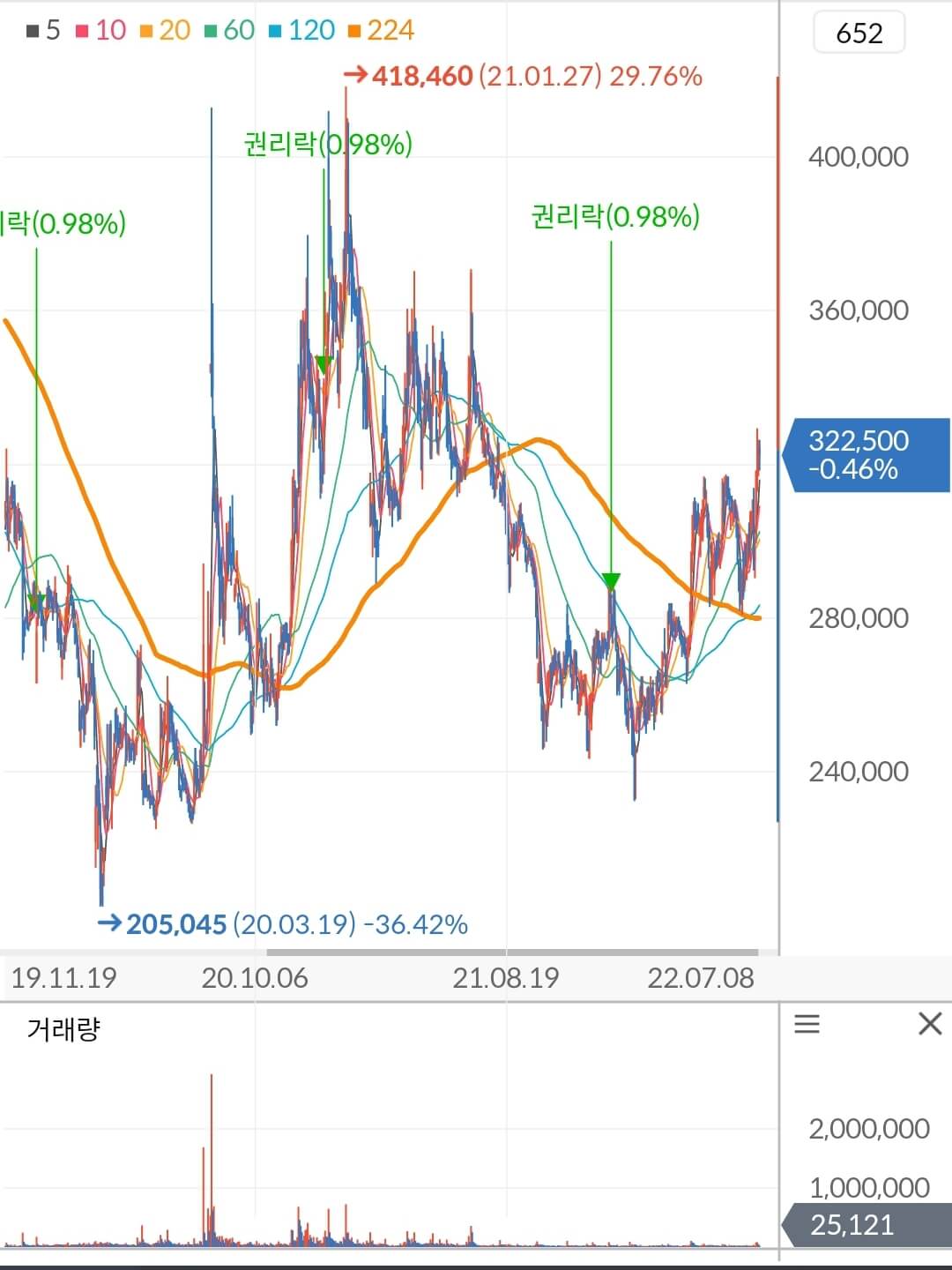 - 장기 이평선 224일선을 돌파 후 2회 지지