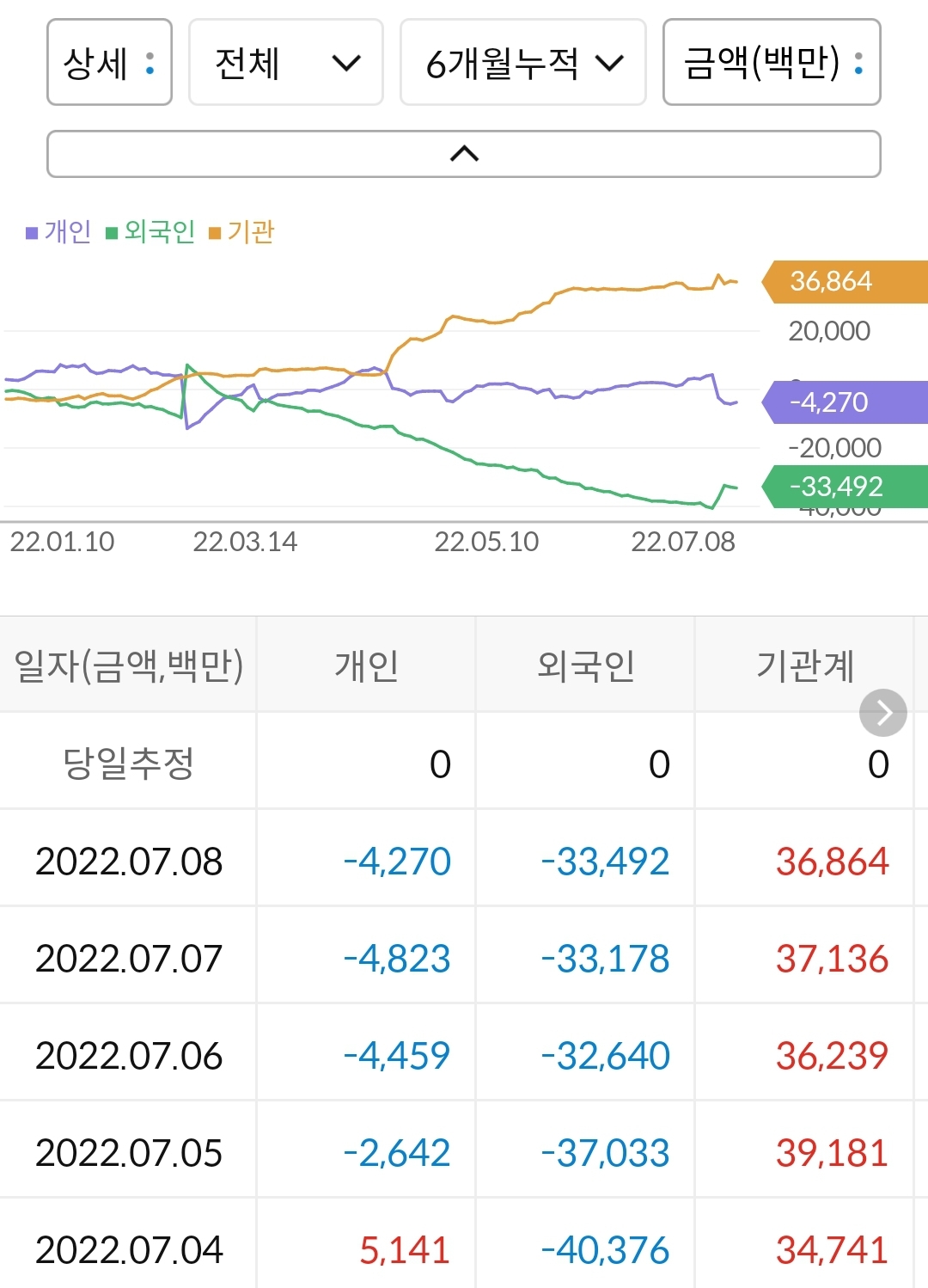 - 개인이 42억 매도, 외국인이 334억 매도, 기관이 368억 매수