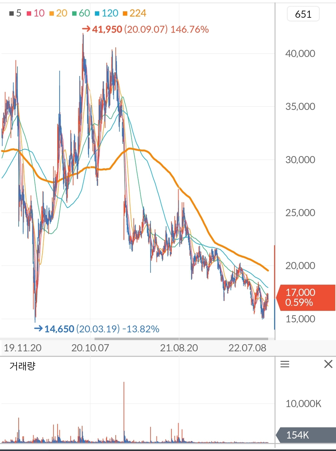 - '20년 3월 코로나 팬데믹 선언 ▼ 주가 14,650원까지 하락