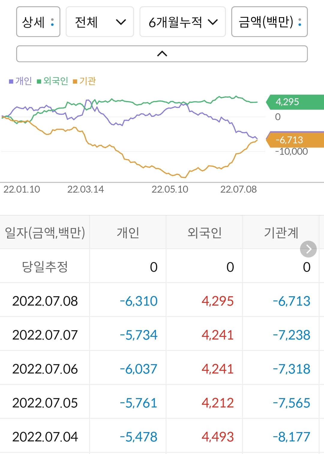 - 개인이 63억 매도, 외국인이 42억 매수, 기관이 67억 매도