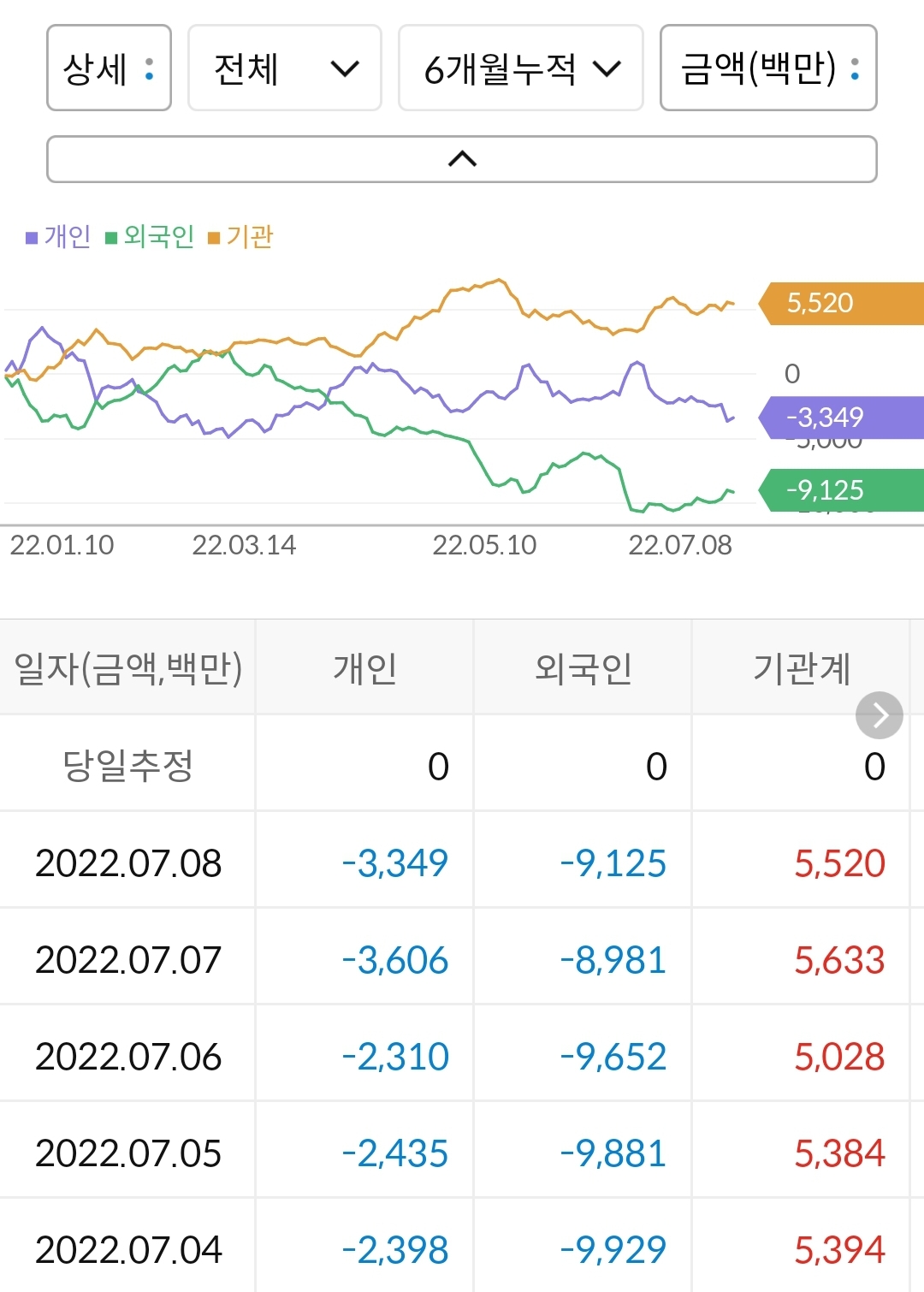 - 개인이 33억 매도, 외국인이 91억 매도, 기관이 55억 매수