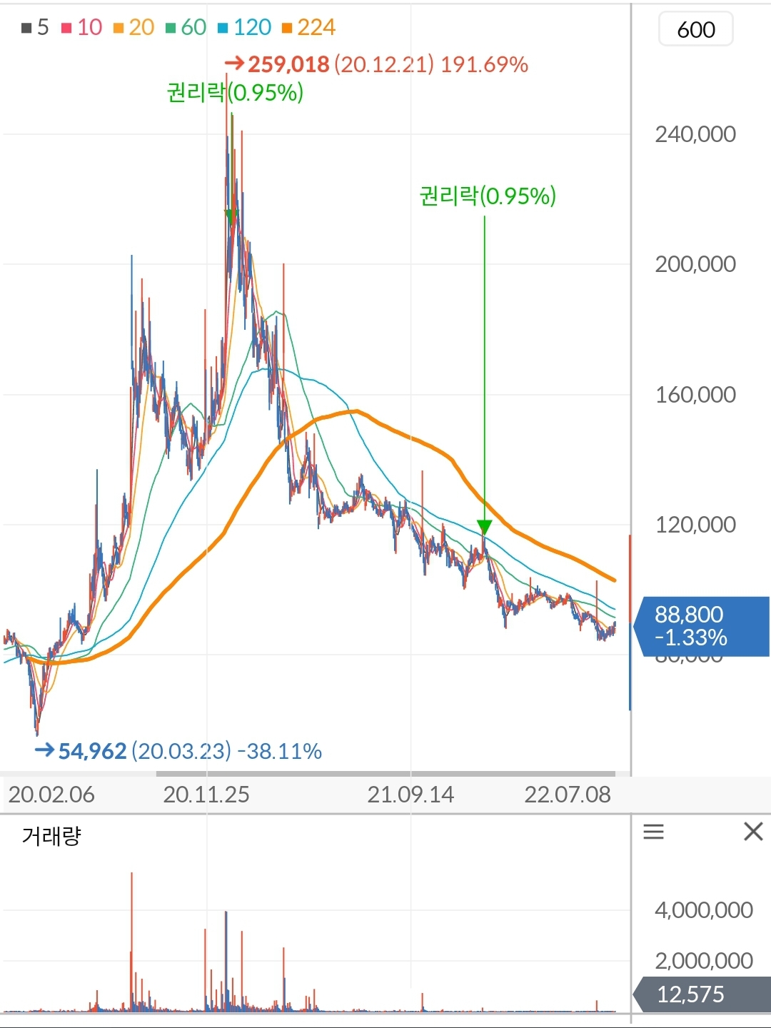- '20년 3월 코로나 팬데믹 선언 ▼ 주가 54,000원까지 하락
