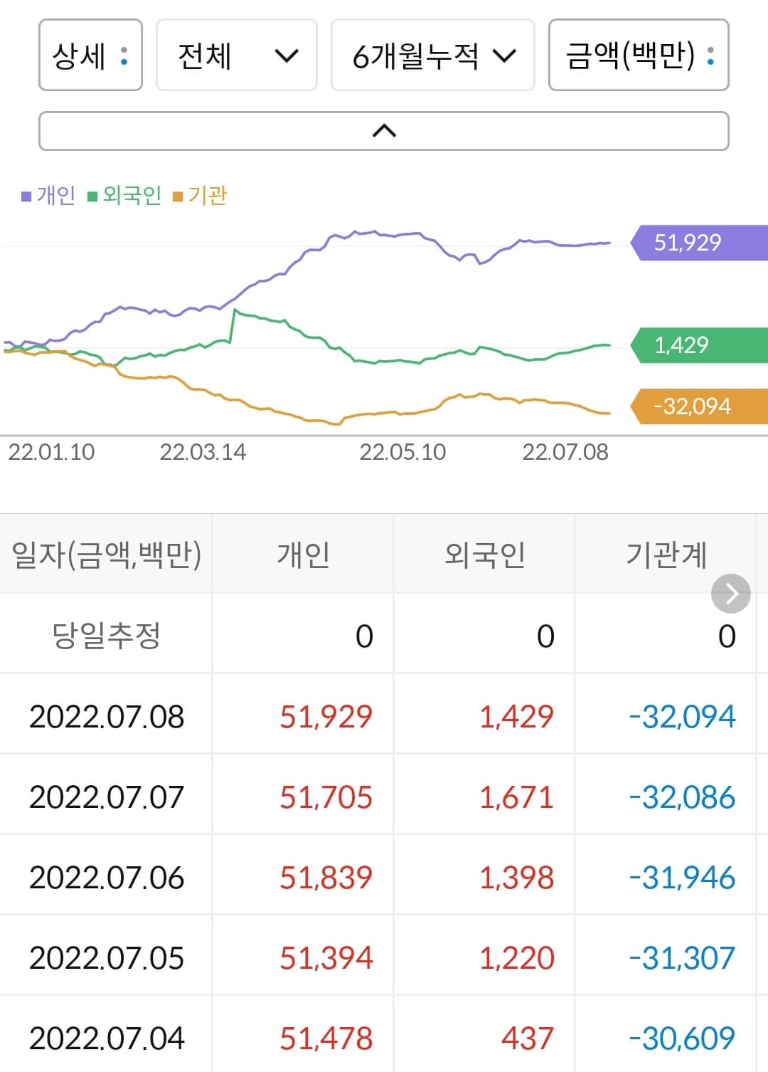 - 개인이 519억 매수, 외국인이 14억 매수, 기관이 320억 매도