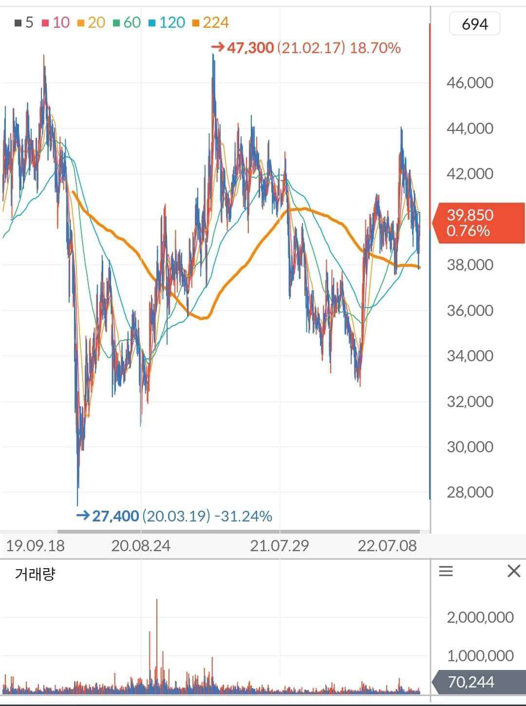 - 장기 이평선 224일선을 발판 삼아 추세전환 시도 중
