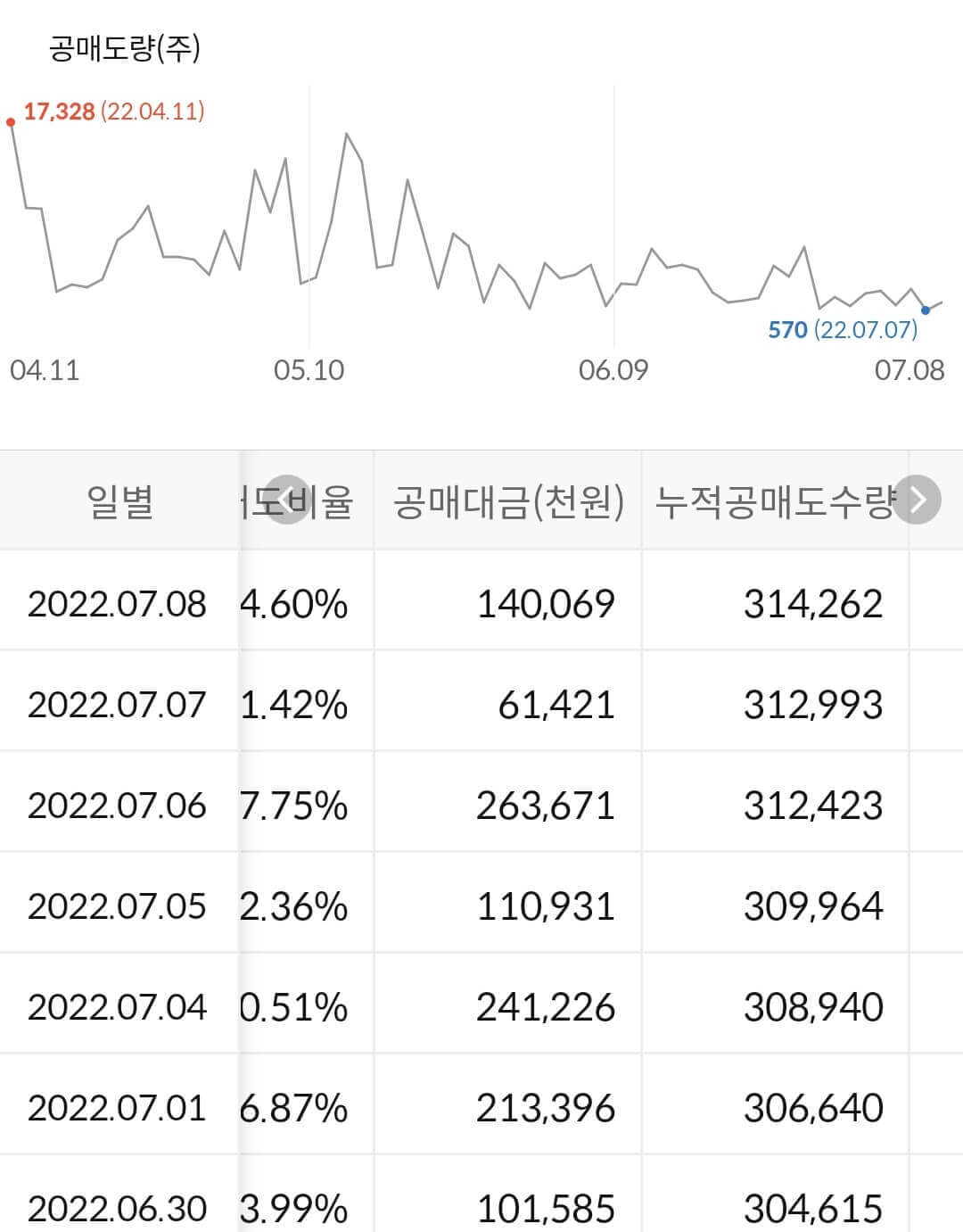 주가가 과도하게 하락한 상황이므로 일일 공매도 수급이 많지는 않은 상황입니다. 하지만 유동성이 너무 부족해 적은 공매도 금액에도 일일 거래 금액의 6~8%까지 차지하는 현상은 좋아 보이지는 않습니다.