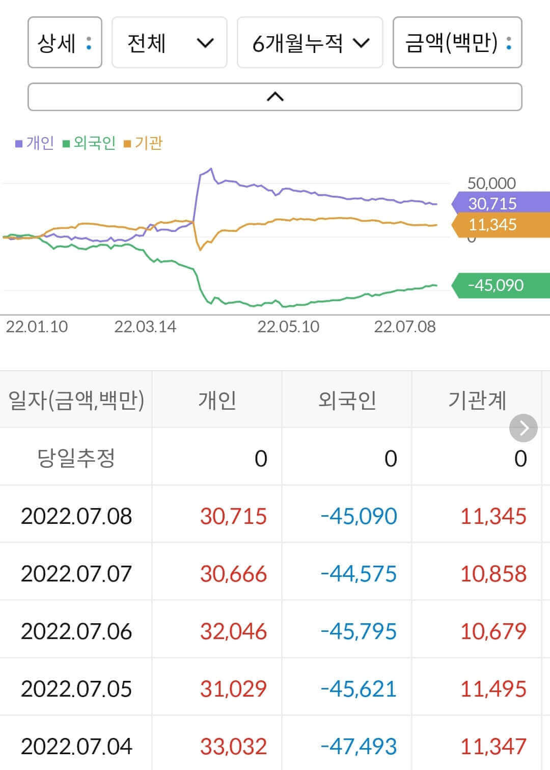 - 개인이 307억 매수, 외국인이 450억 매도, 기관이 113억 매수