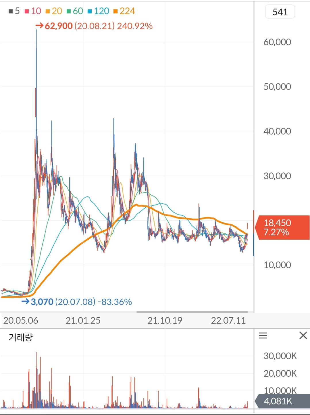 2) 저점 대비 20배 상승한 종목인 만큼, 종목 피로도 및 악성 매물대가 상당한 상황