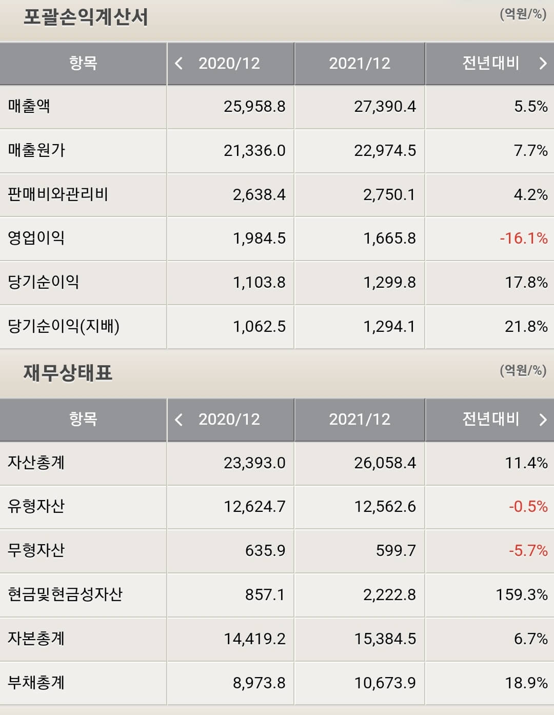22년 1분기 실적은 매출액 7,424억, 영업이익 590억으로 21년 하반기에 단행한 가격 인상건이 빛을 발하며 시장 전망치를 크게 상회하는 어닝 서프라이즈를 기록했습니다. 21년에 이어 물류 및 원재료 비용이 더 상승했으나, 제품 가격 인상으로 일부 손실분 상쇄에 성공했고 타이트한 비용, 원과 관리를 통해 수익성 극대화에 성공했습니다.