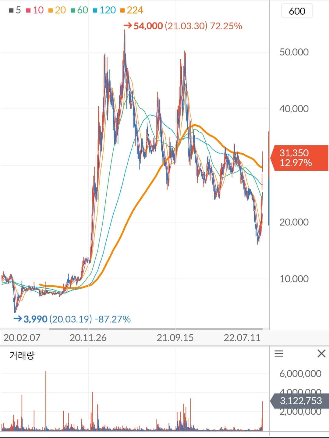 - 거래량 차트를 보면 최근 시장의 관심이 집중됨