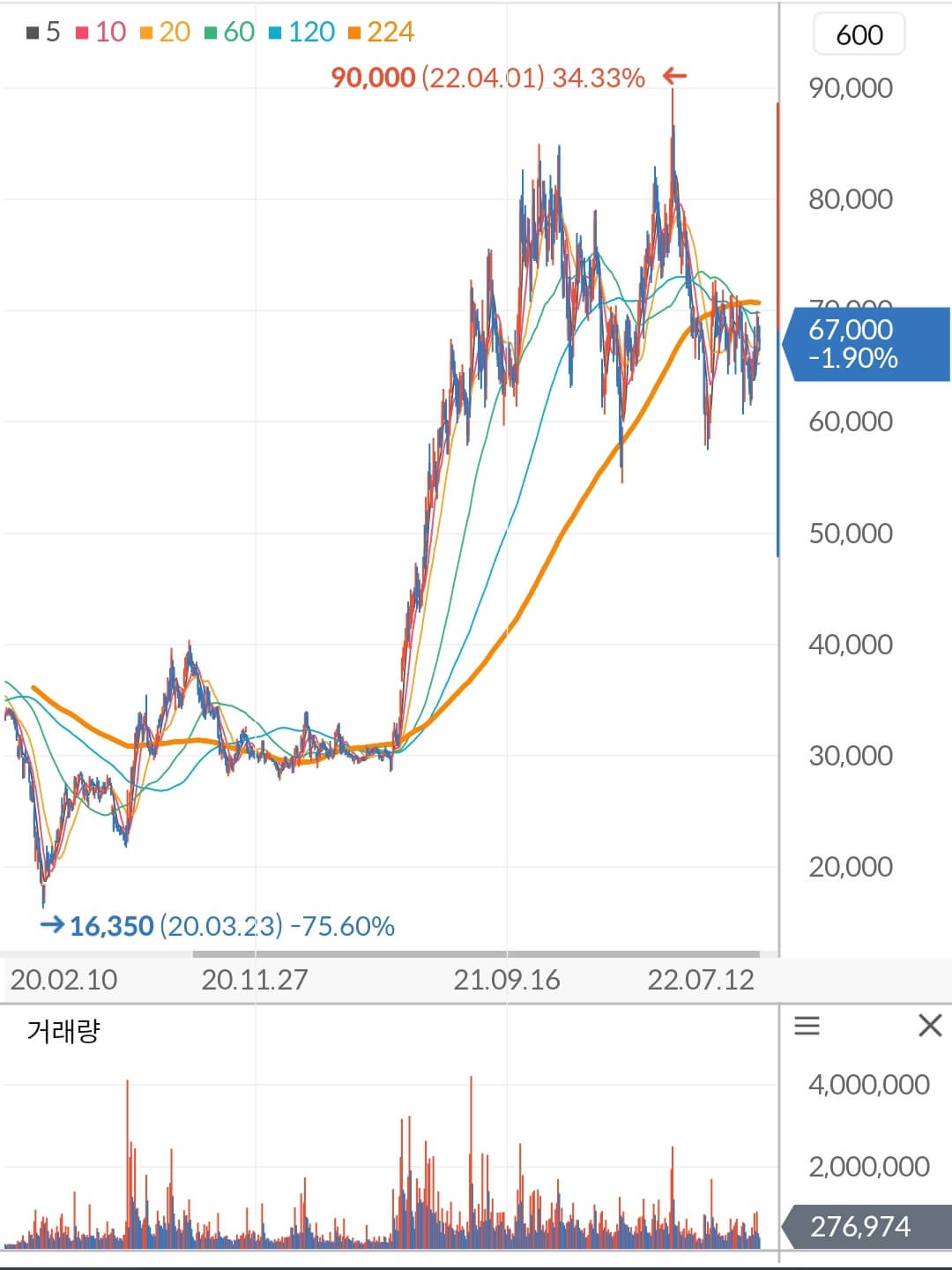 - '20년 3월 코로나 팬데믹 선언 ▼ 주가 16,000원까지 하락