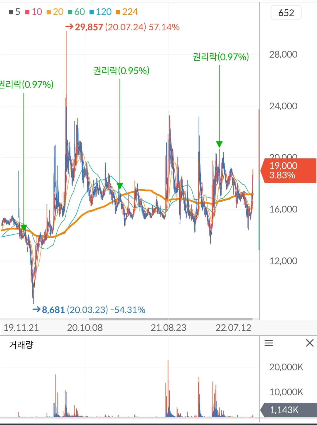 - 테마 소멸 후 224일 기준으로 횡보 중 ▼▲ 주가 18,000원대 횡보