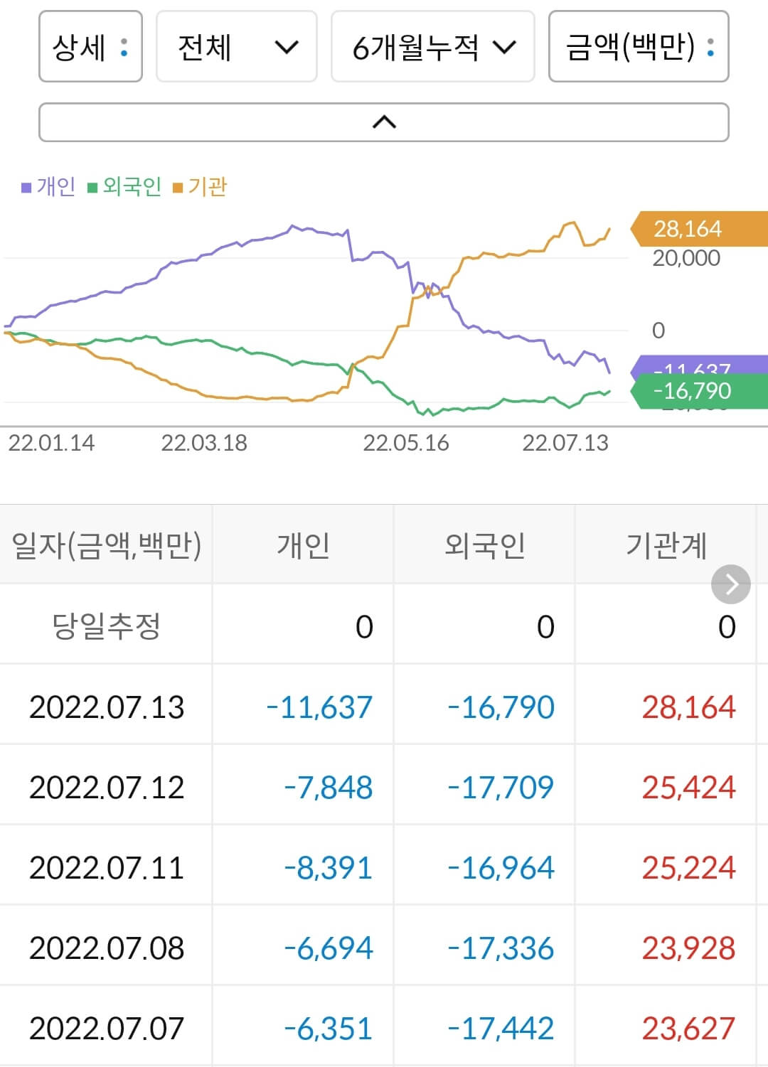 - 개인이 116억 매도, 외국인이 167억 매도, 기관이 281억 매수