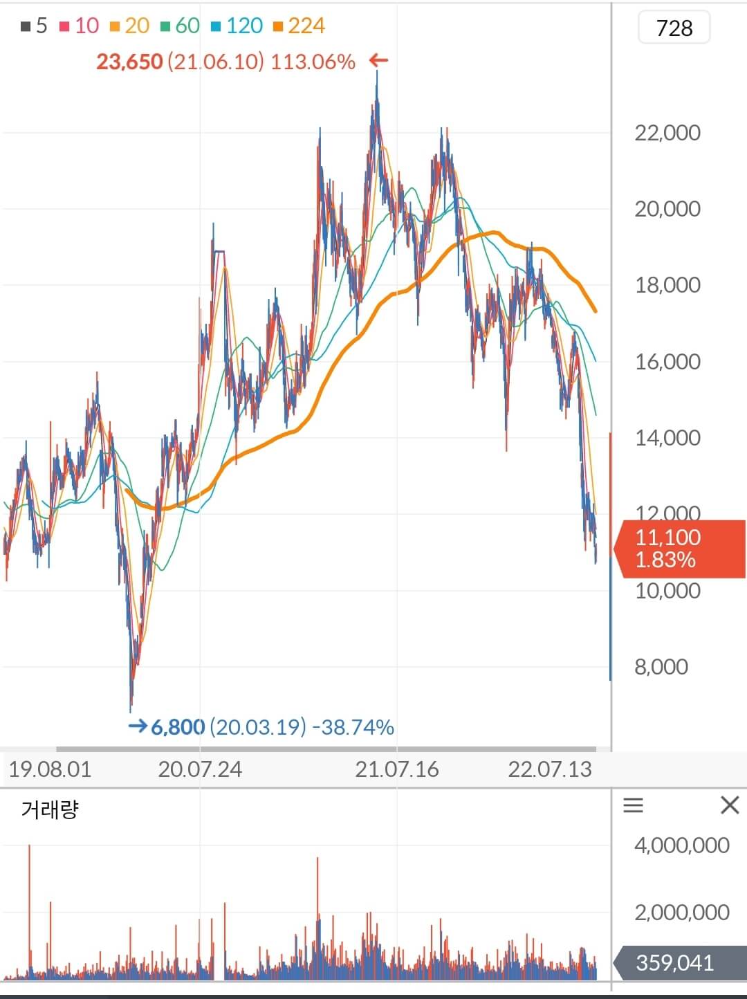 - 오미크론으로 코로나 시대 연장 및 글로벌 지수 폭락 ▼ 주가 11,000원대 하락