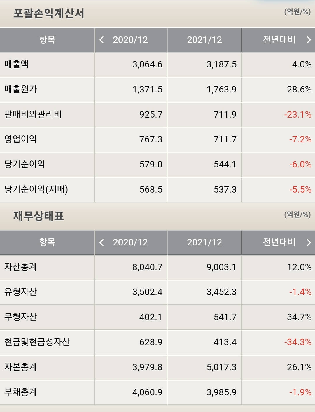 - 매출이 성장하고 비용이 대폭 감소했음에도 원가의 급증으로 수익성 악화