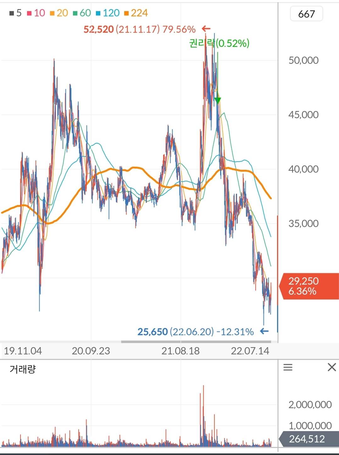다만 현재 자리에서 다시 한번 주가가 이탈한다면 22,000원 지지 여부를 테스트하러 갈 확률이 매우 높다는 것을 감안하고 전략을 구상하셔야 합니다. 매수 전에 다양한 시나리오에 대한 전략을 구상해놓지 않으면 좋은 심리상태 유지가 힘들며 그로 인해 뇌동매매를 할 가능성이 비약적으로 증가합니다. 따라서 다양한 상황에 대해 미리 구상을 해놓으시고 사전에 정해놓은 원칙대로 기계처럼 매매하시는 것이 시장에 오래 살아남아 성공할 수 있는 좋은 습관임을 강조드립니다.