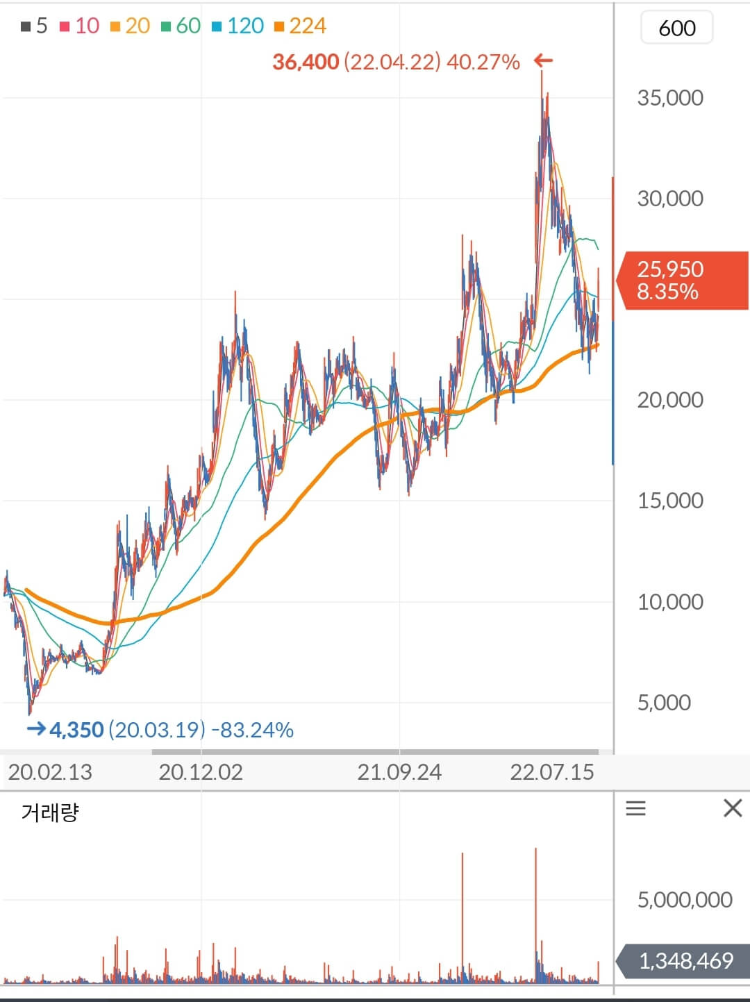 - '20년 3월 코로나 팬데믹 선언 ▼ 주가 4,350원까지 하락