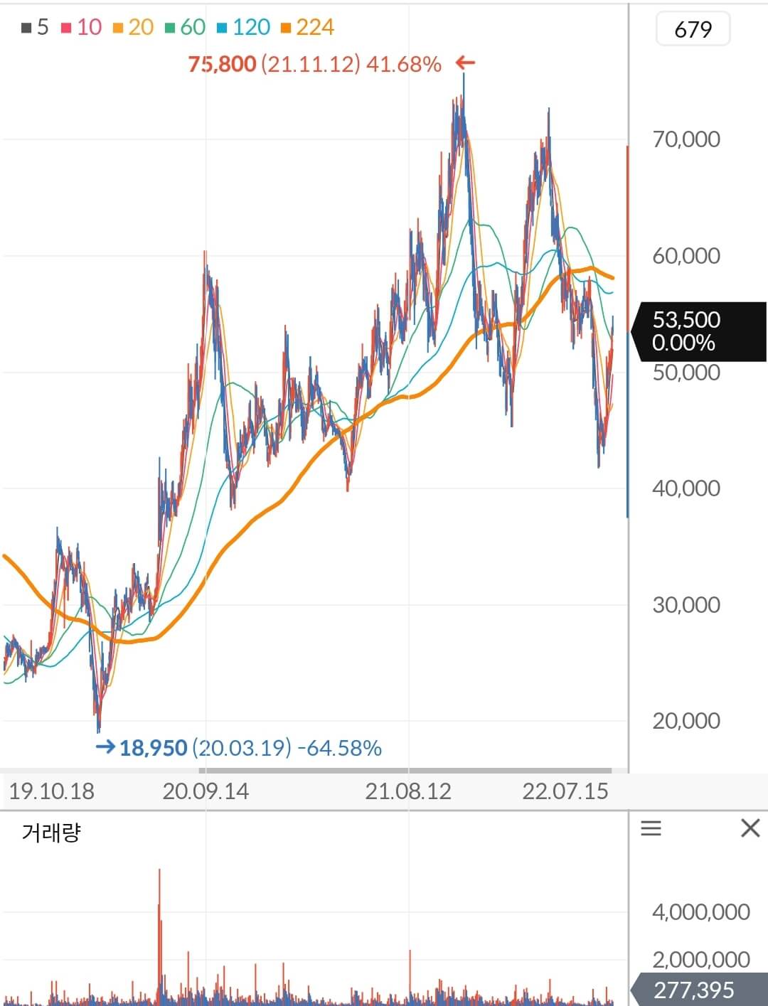 - 소속 아티스트 이탈 및 연준 고강도 긴축 예고에 따라 글로벌 지수 폭락 ▼ 주가 50,000원대 하락