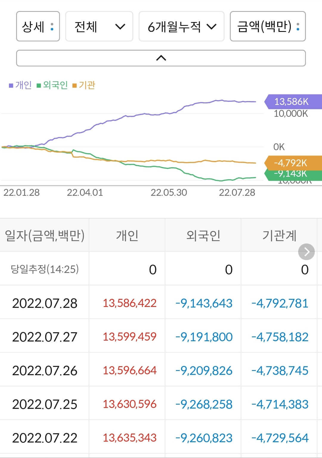 - 개인이 13조 5,864억 매수, 외국인이 9조 1,436억 매도, 기관이 4조 7,927억 매도