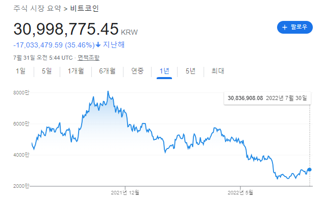어떤 시장이든 간에 하락장에는 거래대금이 줄어들 수밖에 없고 거래를 주관하는 거래사업자에서는 수수료 이익이 급감할 수 밖에 없습니다. 위의 비트코인 시세 차트를 보면 비덴트의 주가가 비슷하게 추종하고 있음을 알 수 있습니다. 21년 말에 최고 8,000만원을 돌파 했던 비트코인의 가격은 최근 3,000만원을 이탈후 재차 회복한 상황입니다.