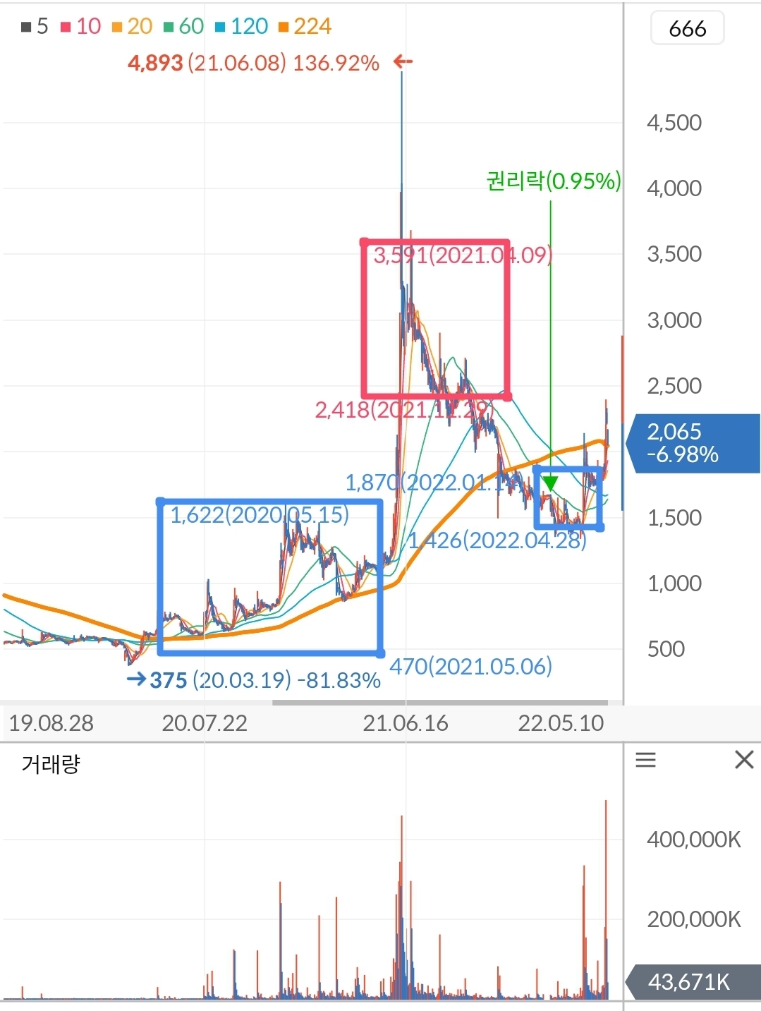 - 현재 주가 상단부에 거대한 매물대가 자리 잡고 있어 향후 주가 상승의 큰 걸림돌이 될 전망
