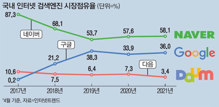 NAVER는 우리나라 검색엔진 시장 점유율 압도적 1위를 유지하고 있는 IT 기업입니다. 압도적인 시장 지위를 바탕으로 다양한 사업구조에서 보다 유리한 포지션에서 손쉽게 수익을 창출해내는 능력은 분명한 프리미엄 요소입니다. 하지만 네이버는 과도한 광고성 콘텐츠들이 블로그와 카페, 지식인등을 점령하는 것을 막지 못하며 정보성 콘텐츠 검색 트래픽은 구글에게 대부분의 지분을 넘겨주었습니다. 구글의 높은 수용성과 높은 마케팅 수익 배분율 등이 젊은 층을 중심으로 구글의 사용을 확대시키고 있기에 네이버에게 중장기적으로 분명한 리스크입니다.