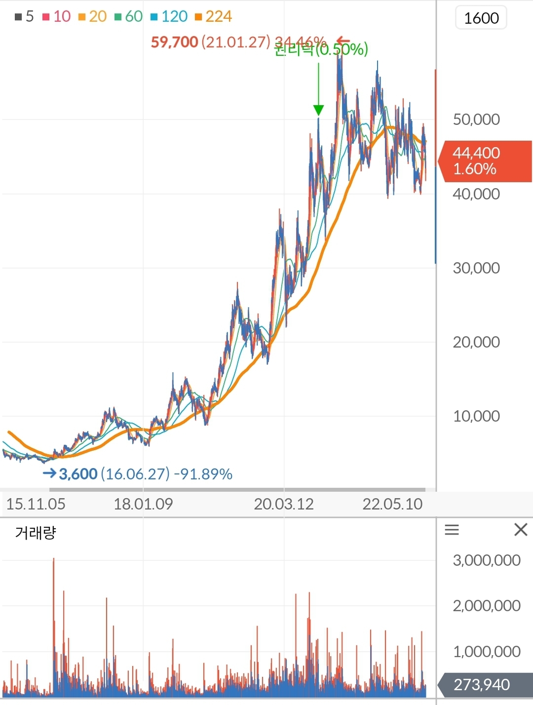 테스나는 '16년 03월에 최저점 3,600원을 찍은 후 '20년 03월 코로나 시기에도 18,000원 선을 잘 지키고 상승하여 작년 1월 59,700원까지 상승했습니다. 이는 '16년 저점 대비 약 1,800% 상승한 수치입니다. 주가 상승 배경에는 반도체 업황 개선으로 한해도 거르지 않고 매년 매출액, 영업이익, 당기순이익 모두 성장하는 트리플 성장이 있었습니다. 테스나의 차트는 매년 성장하는 주식은 코로나 같은 글로벌 악재에도 버틸 수 있다는 점을 확인할 수 있는 좋은 지표입니다. 최근에만 봐도 글로벌 재정 긴축으로 전 세계 지수가 폭락하고 있는데 테스나는 타 종목 대비 굉장히 잘 버티고 있는 모습입니다. 코스피, 코스닥에 상장한 기업들 중 현재 코로나 전저점에 근접하거나 깨고 주저앉은 경우도 많기 때문에 상대적으로 테스나의 힘이 체감이 되는 상황입니다. 고점에서도 크게 거래량이 터진 흔적도 없고 단순히 시장 상황에 따라 차익실현 욕구가 커진 것으로 보입니다. 하지만 약점도 분명히 존재하겠죠. 뒤에 주가전망에서 다뤄보겠습니다.