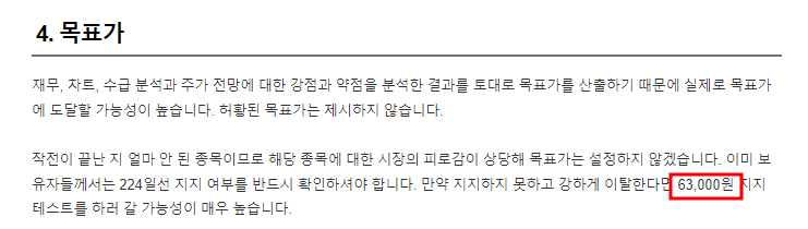- 63,000원이 차트상 강한 지지라인으로 볼 수 있음, 깨지면 심각한 상황