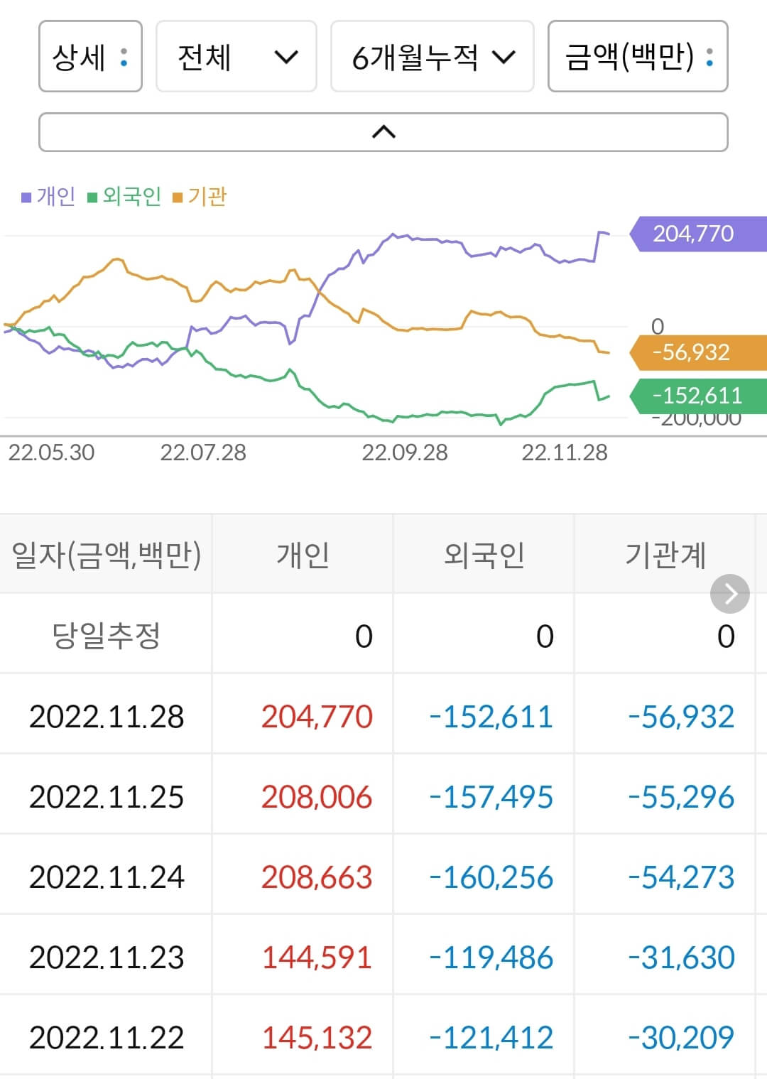 - 개인이 2,047억 매수, 외국인이 1,526억 매도, 기관이 569억 매도