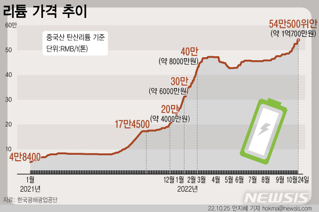 리튬 테마가 코스피, 코스닥을 뒤흔들고 있습니다. 그 이유는 아래 리튬 가격 추이를 보시면 알 수 있습니다.