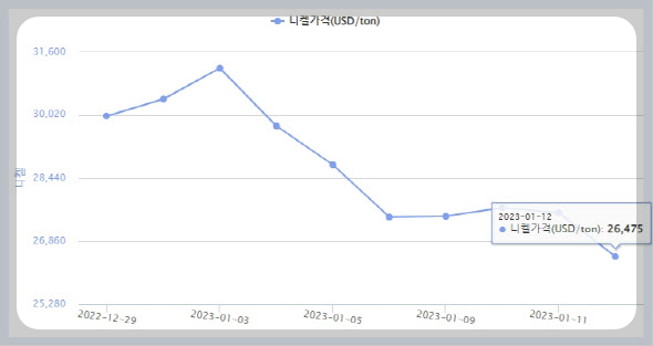 1) 리튬, 코발트, 니켈 등 원자재 가격 고점찍고 하락 중