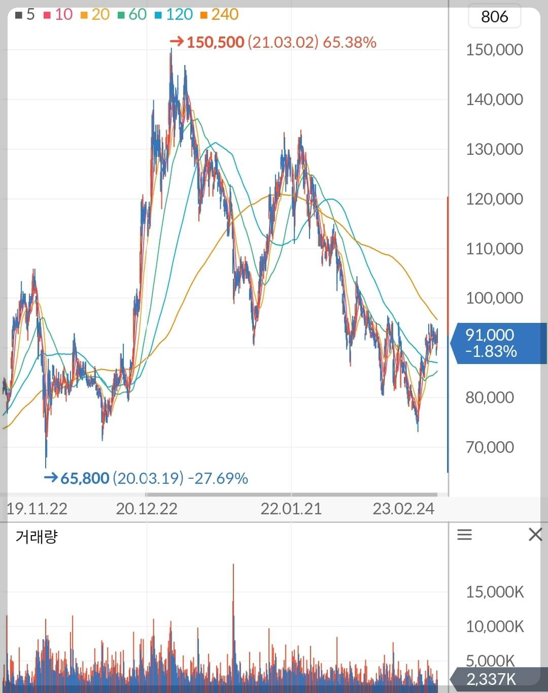 - '20년 3월 코로나 팬데믹 선언 ▼ 주가 65,800원까지 하락