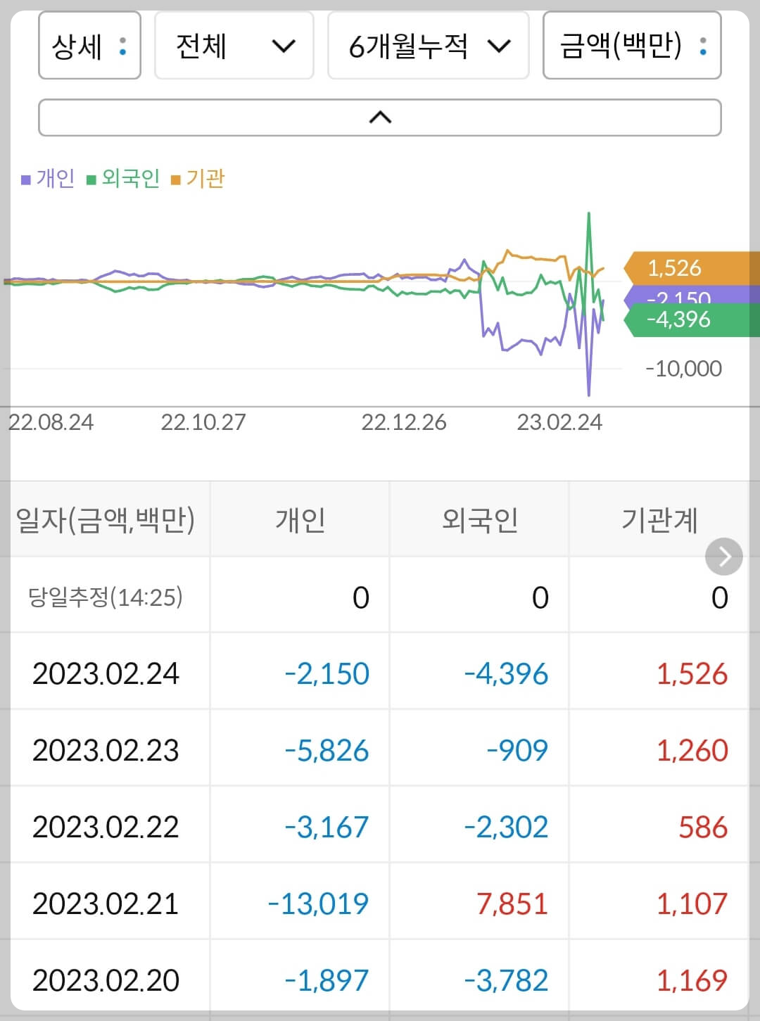 - 개인 21억 원 매도, 외국인 43억 원 매도, 기관 15억 원 매수
