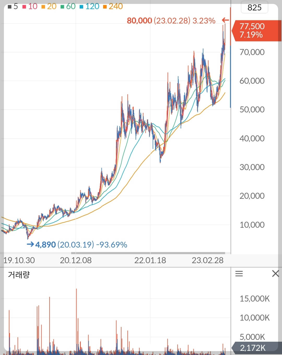 - '20년 3월 코로나 팬데믹 선언 ▼ 주가 4,890원까지 하락