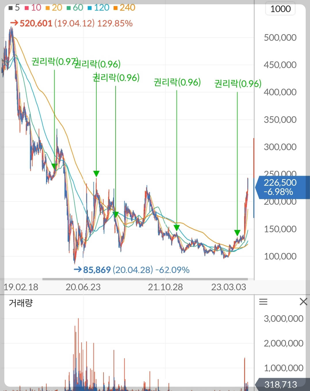 - 식약처 행정처분 정지 및 대웅제약과의 소송 1심 승소 ▲ 주가 220,000원대 상승