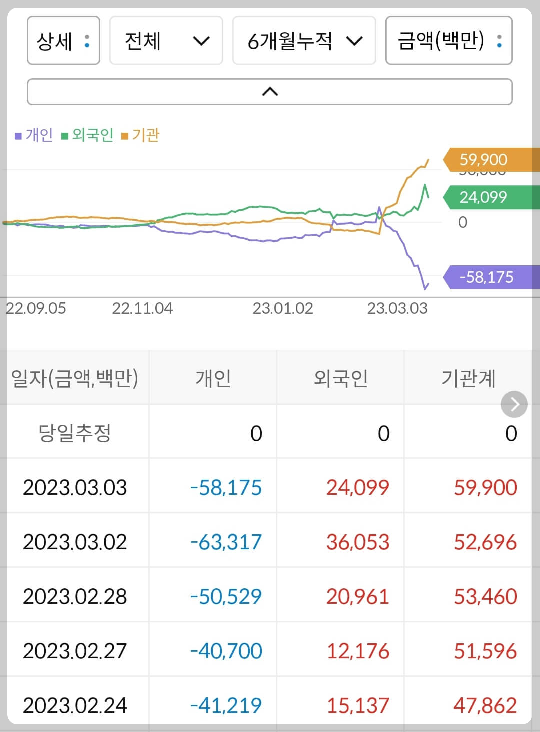 - 개인 581억 매도, 외국인 240억 매수, 기관 599억 매수