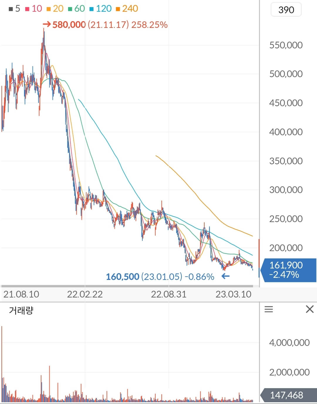 22년 이후로 크래프톤에 물타기 매수를 하셨다면 주식을 떠나시는 것이 소중한 자산을 지키는 길일 겁니다. 크래프톤은 배틀그라운드가 정점을 찍으며 이익창출능력이 감소하기 시작했고 신작이 부재함에 따라 역성장이 확정되자 폭락하기 시작했습니다. 급락 이후에도 거래량이 붙지 않았으며 고점과 저점을 매번 낮춰가며 가파른 하락 추세를 이어나가고 있습니다.