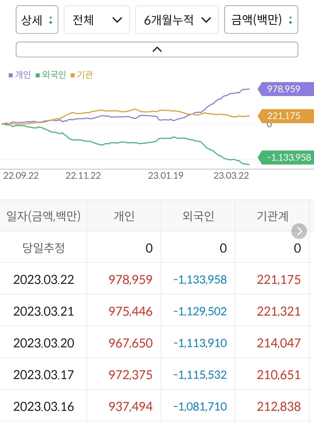 - 개인 0.97조 매수, 외국인 1.1조 매도, 기관 0.2조 매수