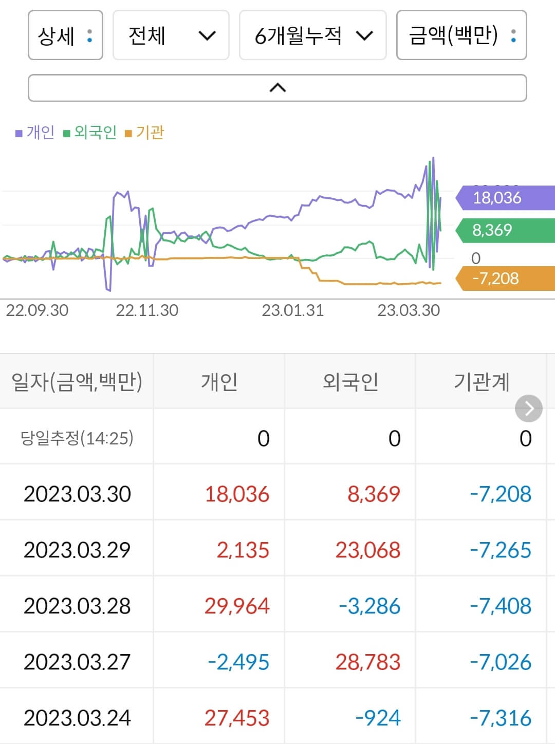 - 개인 180억 매수, 외국인 83억 매수, 기관 72억 매도