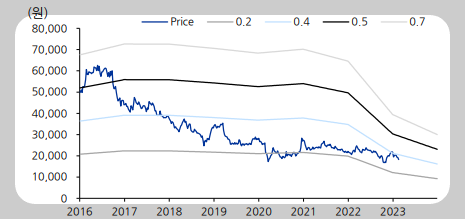 PBR 밴드가 하락 수렴하고 있어 주가 흐름이 긍정적이진 않지만 그럼에도 불구하고 PBR 0.2배 수준에서는 매도보다는 매수가 맞다고 생각되며, 이번 정부의 역량도 이전 정부들과 크게 다를 것 없어 보여 2023년도 대규모 적자에서 벗어날 가능성은 없지만 PBR 0.3배 수준 그 이하로는 과도한 할인이라고 판단되기에 PBR 0.3배를 목표주가로 설정하였습니다. 만약 이 사태를 정부가 장기간 방관해서 한국전력의 자본이 지속적으로 쪼그라든다면 목표주가는 의미 없을 수도 있습니다.